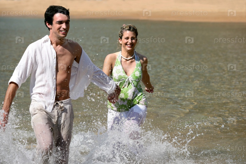 Игривая молодая пара в воде