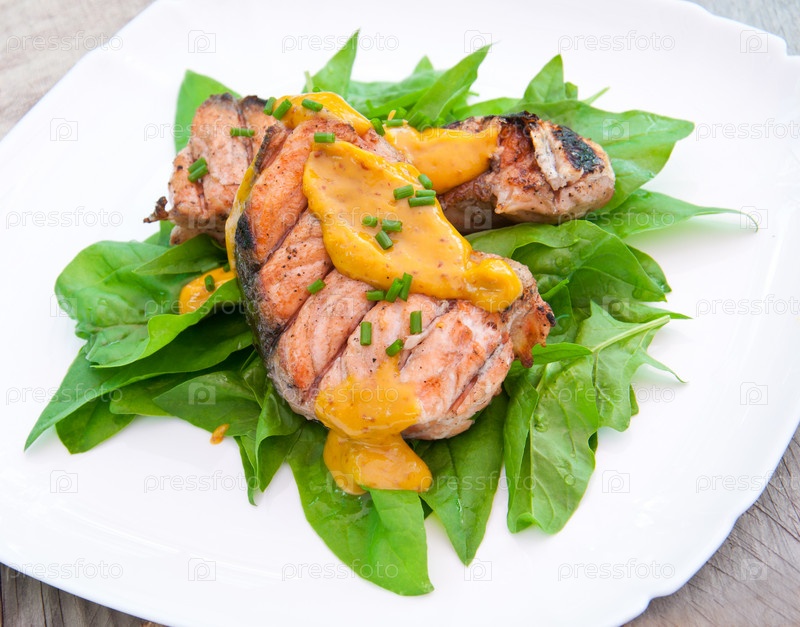 Жареный лосось на подушке из шпината с апельсиново-горчичным соусом