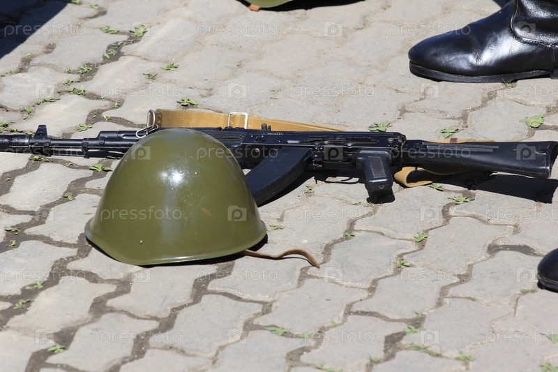 Шлем и штурмовая винтовка лежат на земле