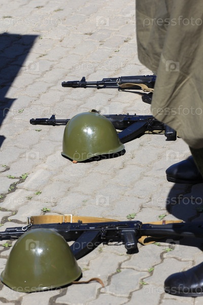 Шлемы и штурмовые винтовки лежат на земле