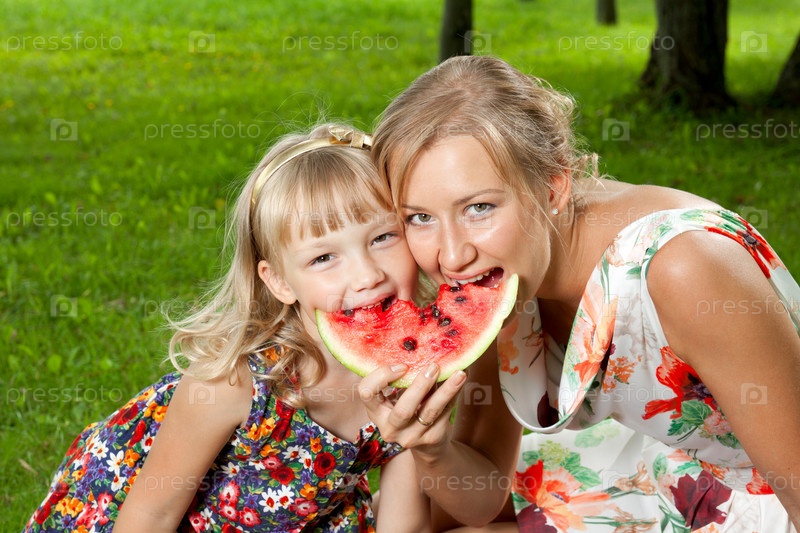 Мать и дочь едят арбуз
