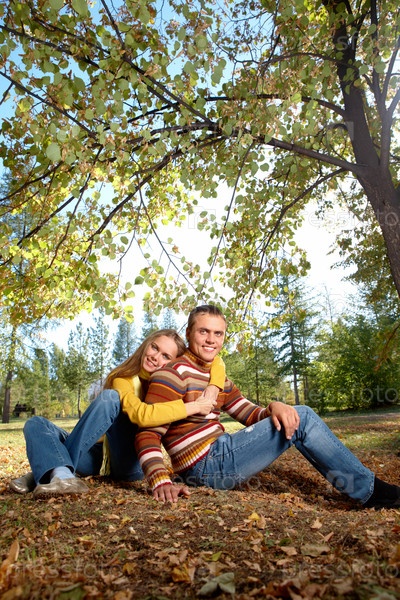Молодая пара обнимается в осеннем парке