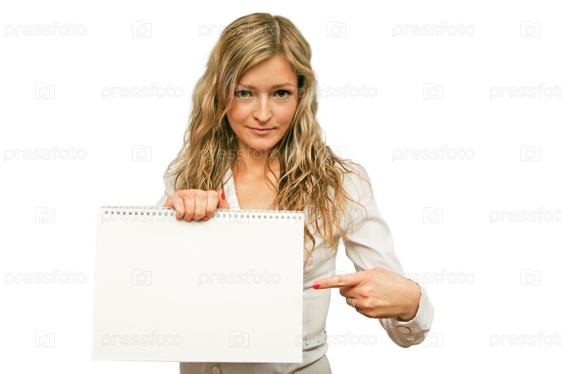 Привлекательная девушка указывает пальцем на чистый лист