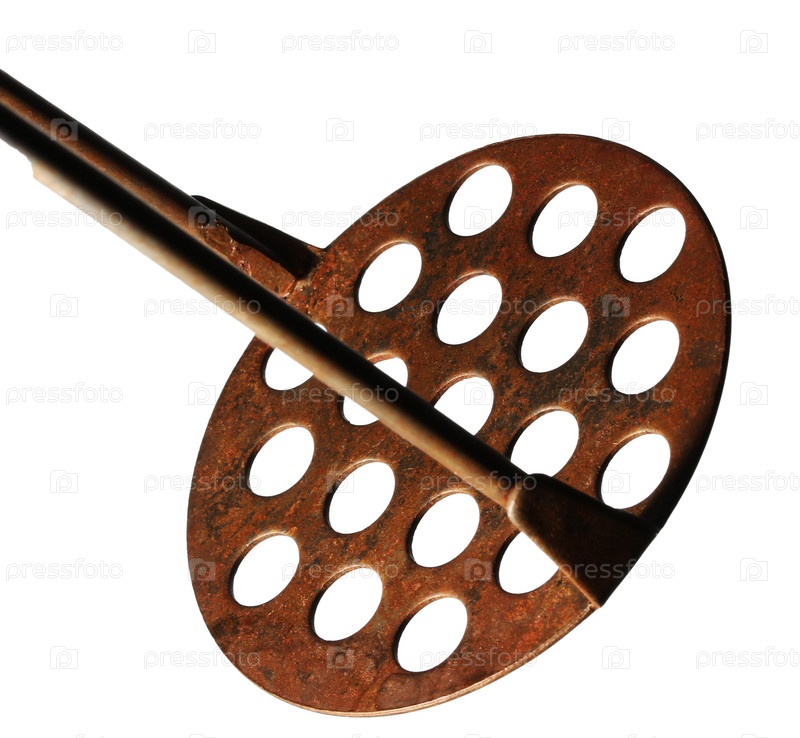Давилка для картофеля с круглыми отверстиями на белом фоне