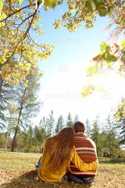 Молодая пара обнимается в парке