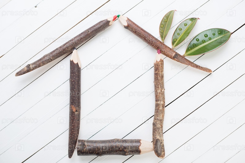 Экологичный дом из деревянных карандашей в виде веток и зеленых листьев