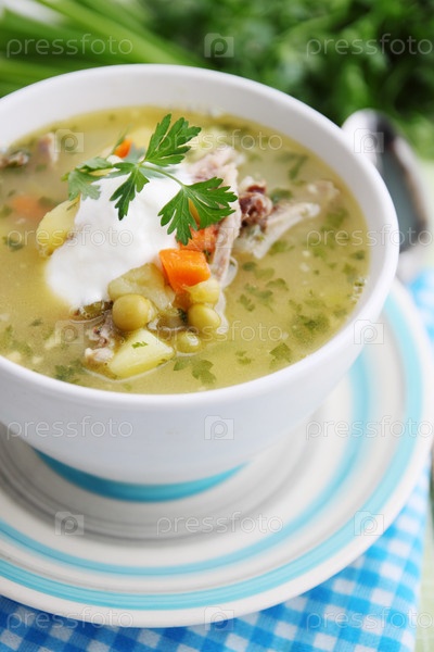 Горячий суп со свежим зеленым горошком и травами