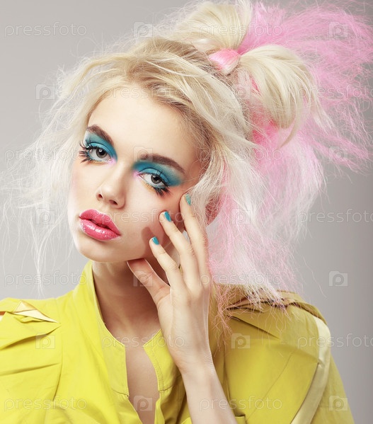 Портрет яркой блондинки с растрепанными волосами и синим макияжем глаз. Глэм