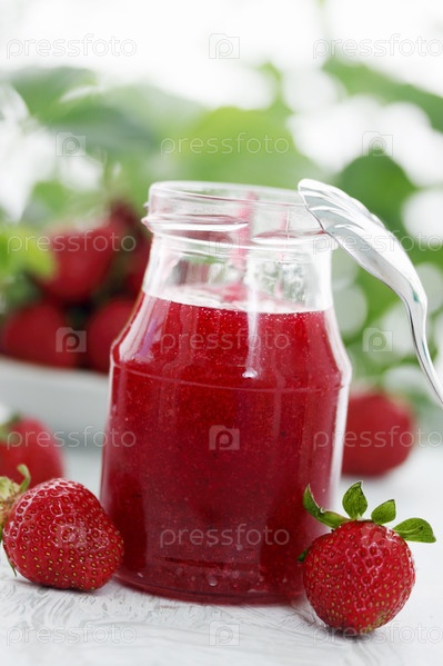 Клубничное варенье в банке, сбор урожая сельскохозяйственных культур