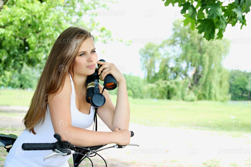 Молодая девушка на велосипеде с биноклем в руке