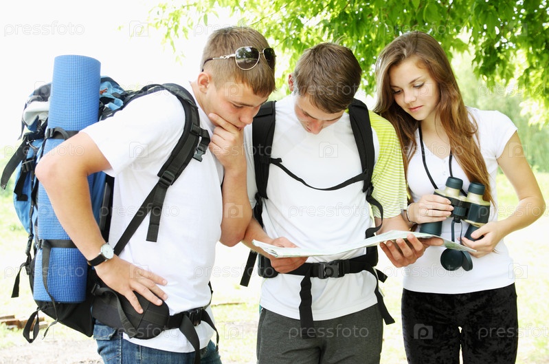 Группа молодых туристов с картой и биноклем