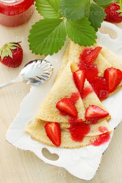 Жареные блинчики со свежей клубникой и джемом