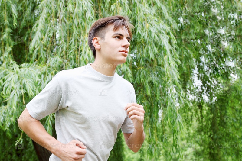 Молодой человек бегает в парке утром