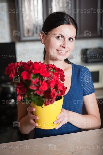 Молодая женщина держит цветок в горшке
