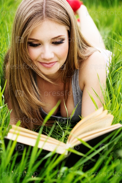 Молодая женщина лежит на зеленой траве и читает книгу