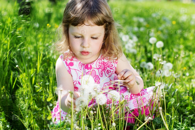 Девочка на лугу с одуванчиками летом