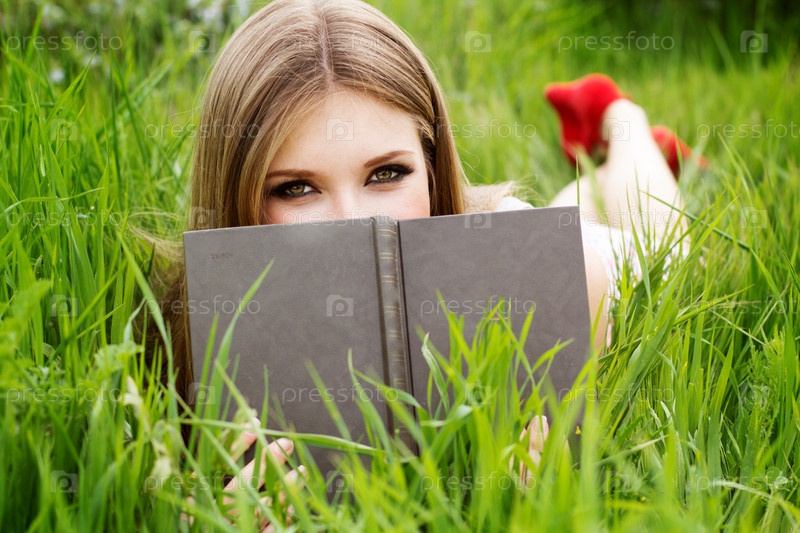 Молодая женщина лежит на зеленой траве и читает книгу