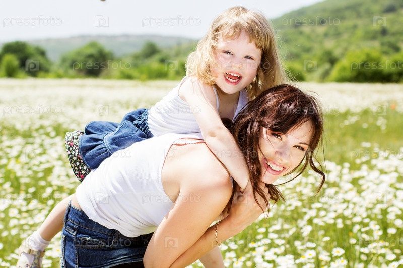 Красивая мать и дочка в поле с ромашками