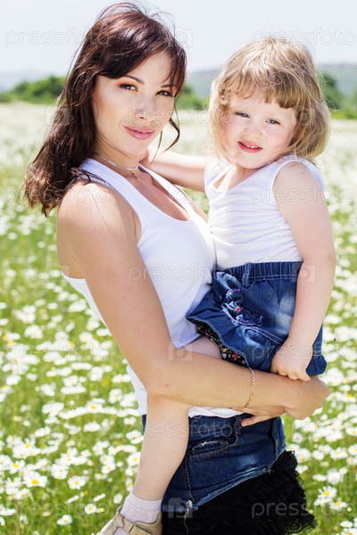 Красивая мать и дочка в поле с ромашками