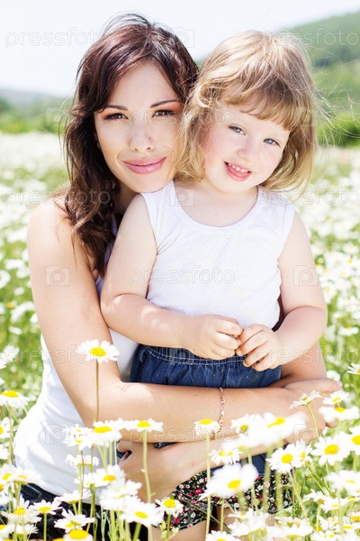 Красивая мать и дочка в поле с ромашками
