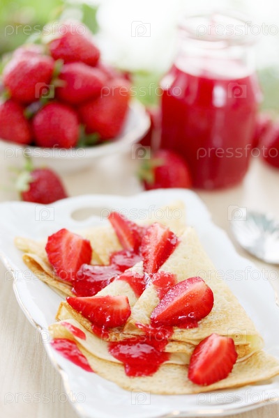 Жареные блинчики со свежей клубникой и джемом