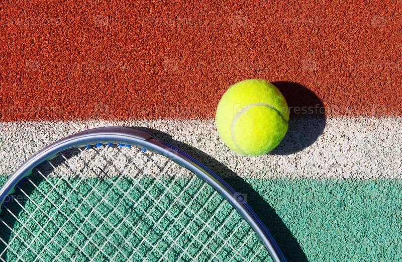 Теннисная ракетка и мяч на теннисном корте крупным планом