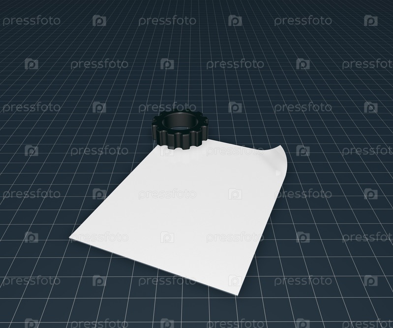 Зубное колесо и лист белой бумаги на синем фоне. 3d Иллюстрация