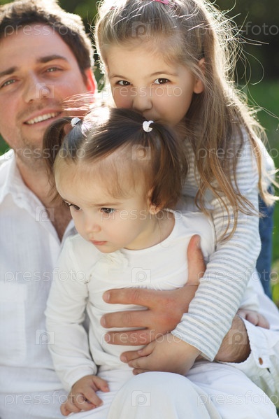 Счастливый молодой отец с двумя дочерьми