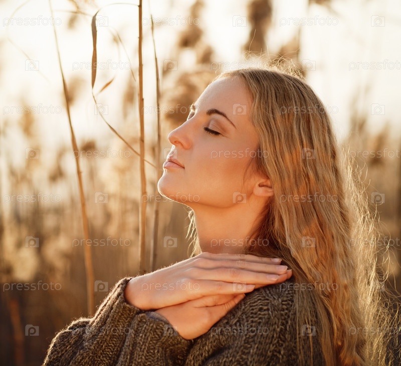 Портрет блондинки, отдыхающей на открытом воздухе осенью