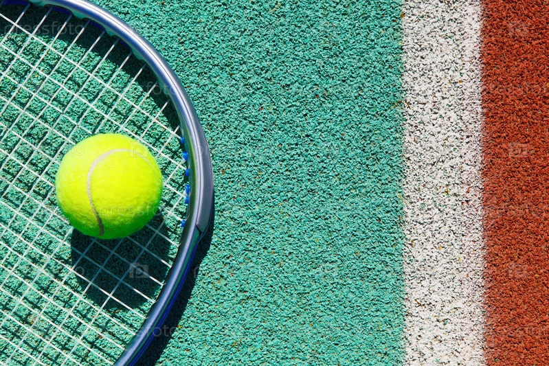Теннисная ракетка и мяч на теннисном корте крупным планом