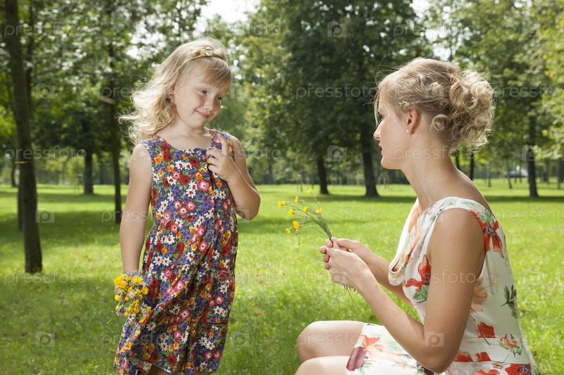 Девочка дает цветы маме