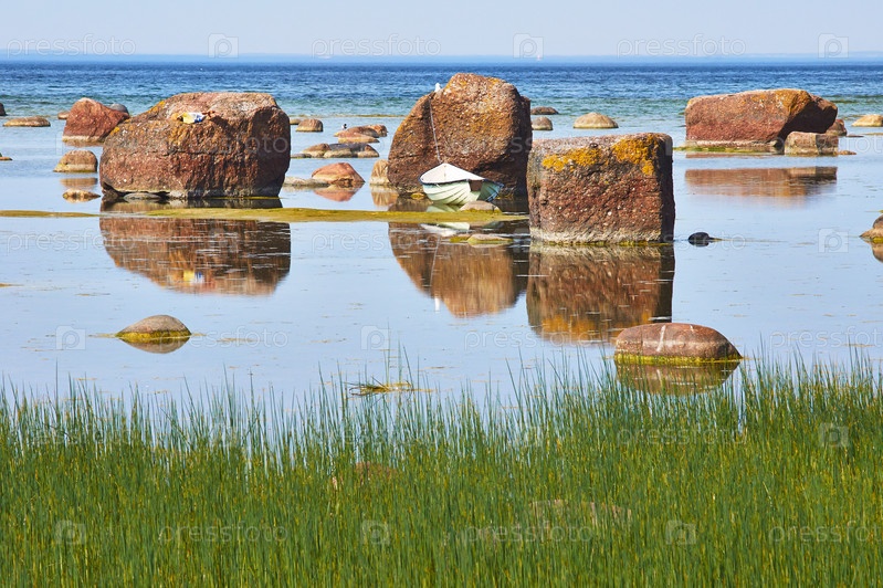 Лодка на берегу моря между крупными камнями
