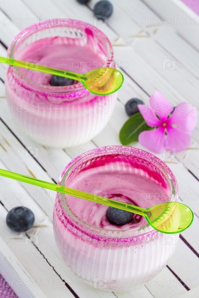 Два стакана йогуртного десерта с зелеными ложками на белом подносе