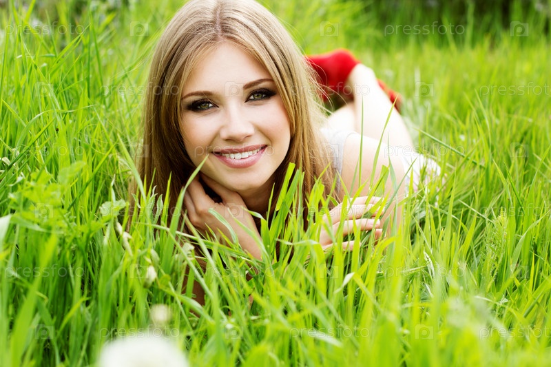 Красивая девушка лежит на траве