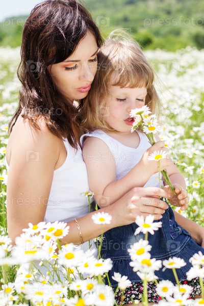 Красивая мать и дочка на поле ромашек