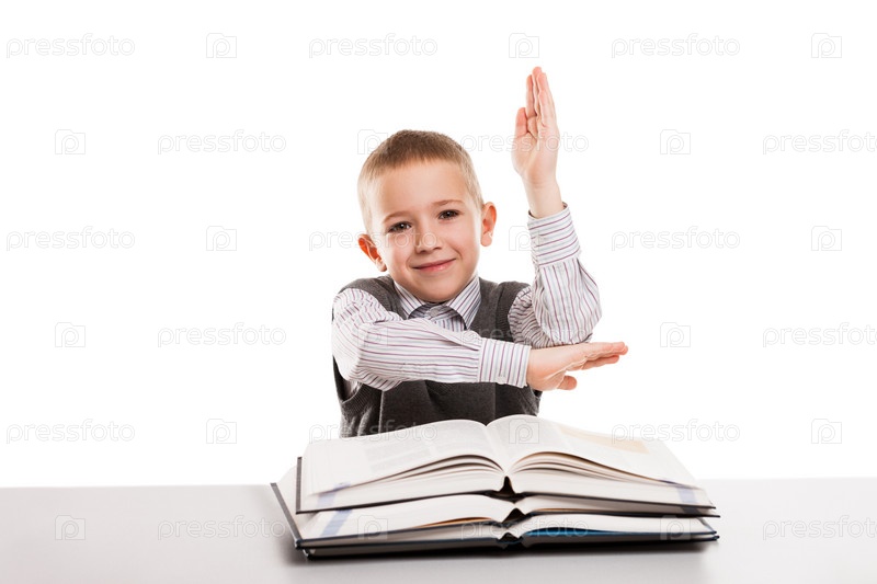 Ребенок с книгами на столе поднимает руку для ответа по домашнему заданию