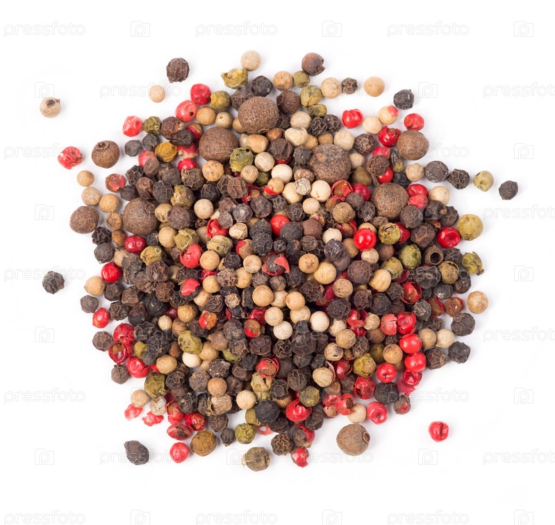 Смесь - красный перец, черный перец, белый перец и зеленый перец, изолированные на белом фоне