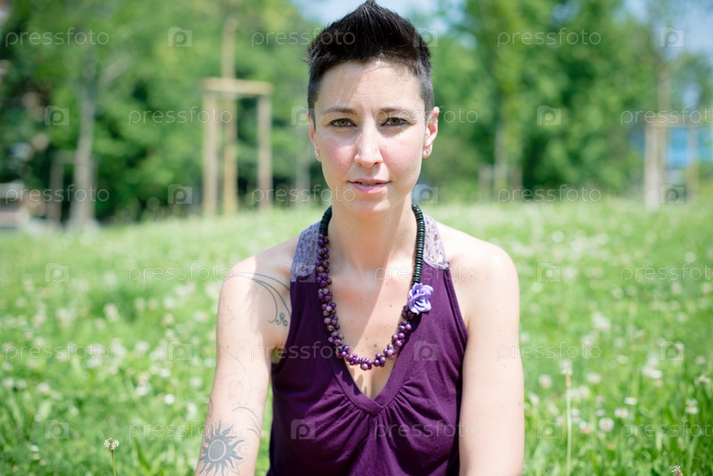 Красивая женщина-хиппи с короткими волосами в парке