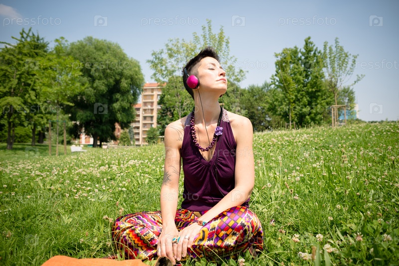Красивая женщина-хиппи с короткими волосами слушает музыку в парке