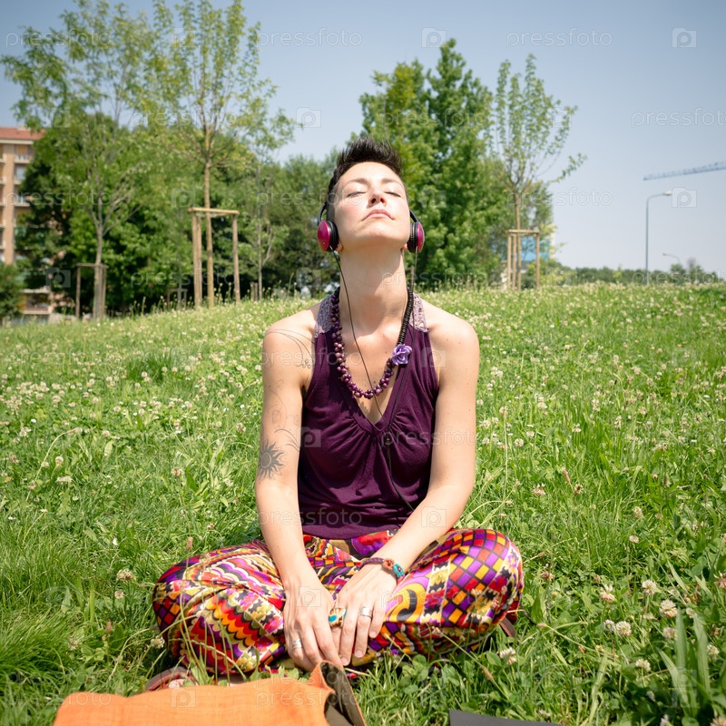 Красивая женщина-хиппи с короткими волосами слушает музыку в парке