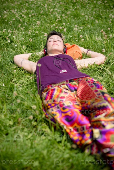 Красивая женщина-хиппи с короткими волосами слушает музыку в парке