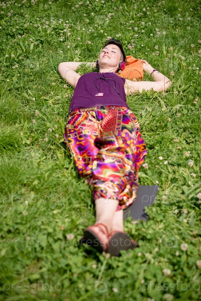 Красивая женщина-хиппи с короткими волосами слушает музыку в парке