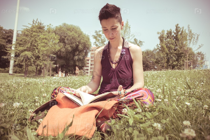 Красивая женщина-хиппи с короткими волосами читает книгу в парке
