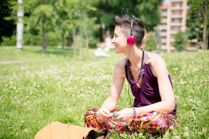 Красивая женщина-хиппи с короткими волосами слушает музыку в парке