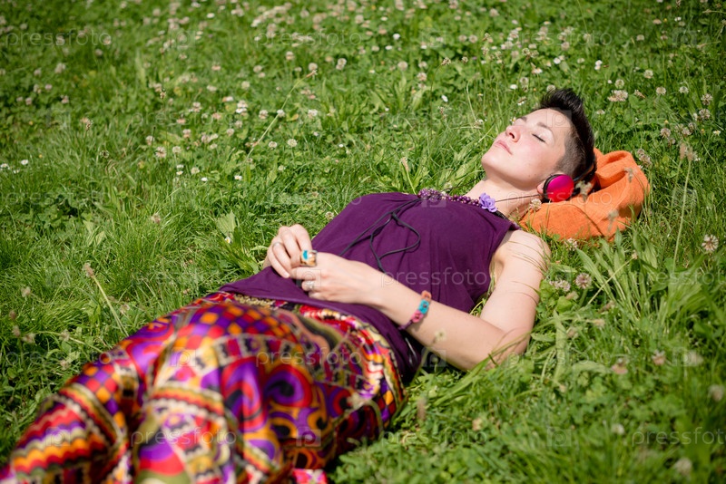 Красивая женщина-хиппи с короткими волосами слушает музыку в парке