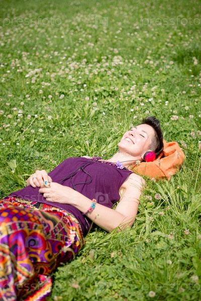 Красивая женщина-хиппи с короткими волосами слушает музыку в парке