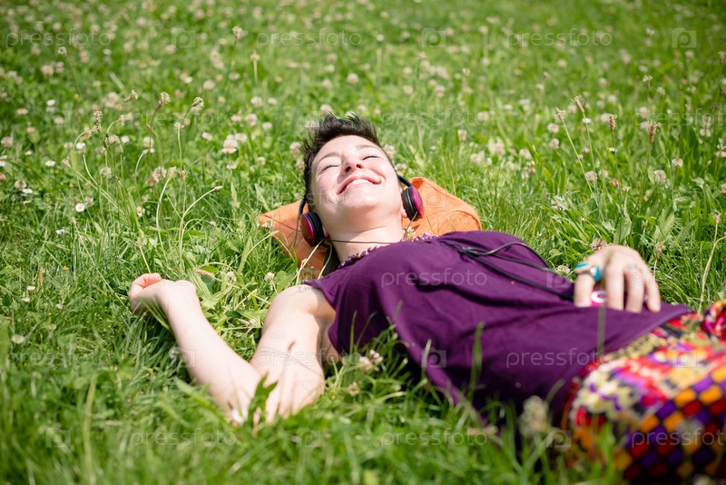 Красивая женщина-хиппи с короткими волосами слушает музыку в парке