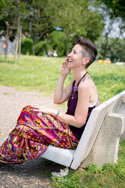 Красивая женщина-хипстер с короткой стрижкой в парке