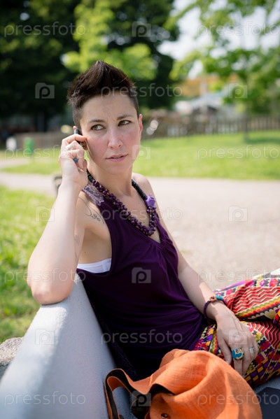 Красивая женщина-хипстер с короткой стрижкой в парке