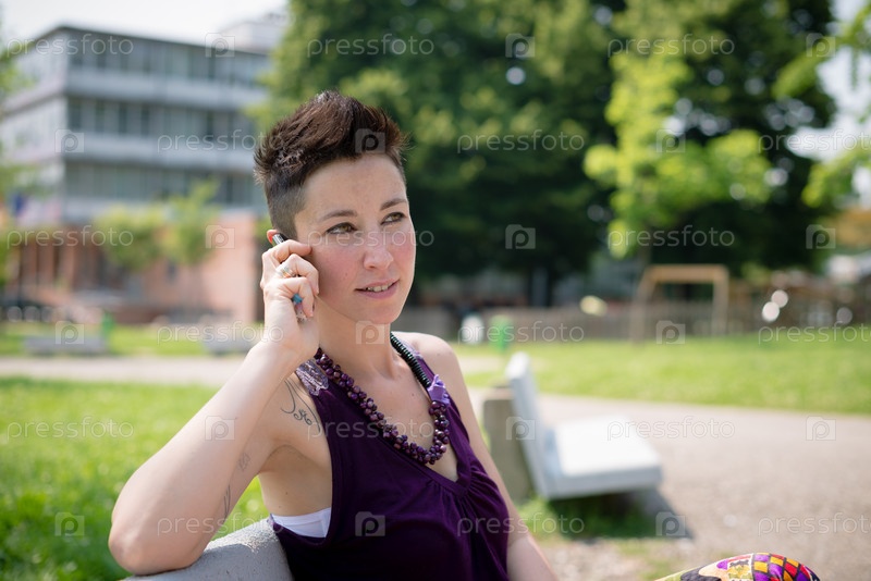 Красивая женщина-хипстер с короткой стрижкой в парке